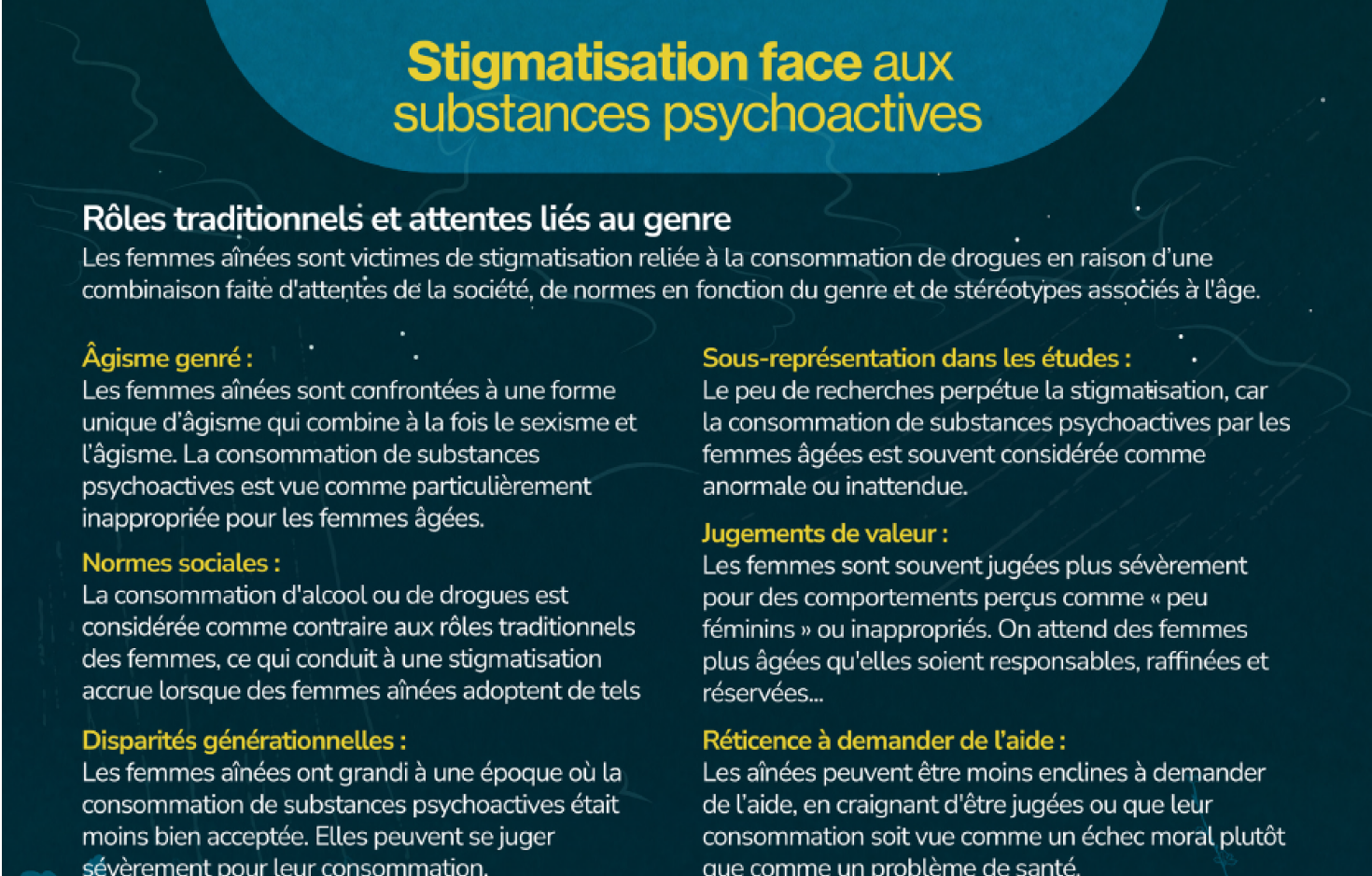 femmes âgées victimes de VFG peuvent se tourner vers la consommation de substances psychoactives comme mécanisme d’adaptation afin de gérer la douleur psychologique et physique associées à leurs traumatismes. La consommation de substances s’inscrit dans un continuum qui englobe des usages bénéfiques, des utilisations à des fins récréatives, ainsi que des utilisations nocives et leurs répercussions. Des stratégies de réduction des risques sont encouragées afin de minimiser les problèmes de santé et autres dommages liés à la consommation de ces substances. Il est donc nécessaire de lutter contre la stigmatisation dont sont victimes les femmes âgées qui consomment des substances psychoactives.